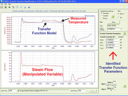 Mediante la toma de datos del proceso de la variable controlada, las posiciones de la válvula de control y los valores del setpoint, llevados estos datos a una hoja Excel, el software Pitops podrá identificar la función de transferencia del proceso en tiempo real en una forma rápida y confiable. Esta función de transferencia se aplica luego a la parte del software que maneja la sintonización de lazos PID, todo ubicado dentro del mismo software, para encontrar los parámetros de sintonía del lazo a sintonizar.